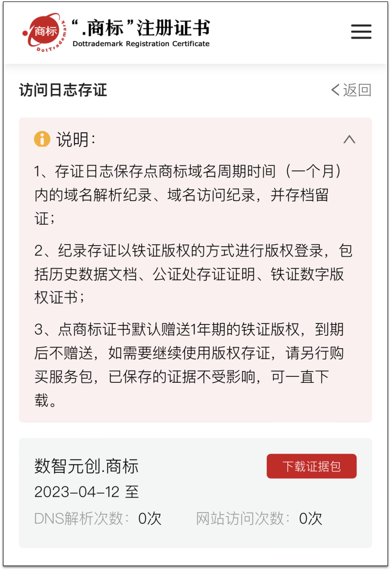 1、存证日志保存点商标域名每个月的域名解析纪录、域名访问纪录,并存档留证;2、记录以铁证版权的方式进行版权登录,包括历史数据文档、公证处存证证没、铁证数字版权证书。